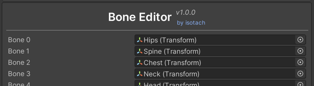 Using the script is super simple, just import the provided unitypackage and select a GameObject in your scene hierarchy that has a Skinned Mesh Renderer component, and click the button at the bottom of its inspector that says Show Bone Editor, as shown below.